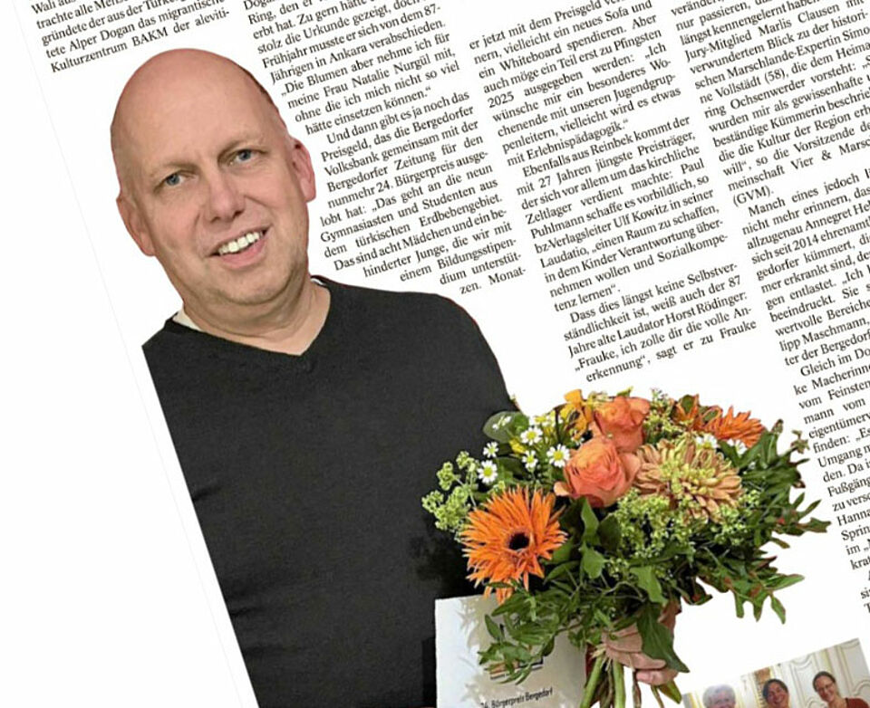 Nicht im Traum hatte er daran gedacht, in die engere Wahl zu kommen. „Ich bin ja meist mit den Jugendlichen im Keller, stehe also selten draußen und vorn. Andere sind da eher im Blickpunkt“, sagt Sönke Rieck als er am Abend der Preisverleihung, aus terminlichen Gründen konnte er leider nicht am Festakt im Rathaus teilnehmen, die Urkunde und einen Blumenstrauß erhielt.
