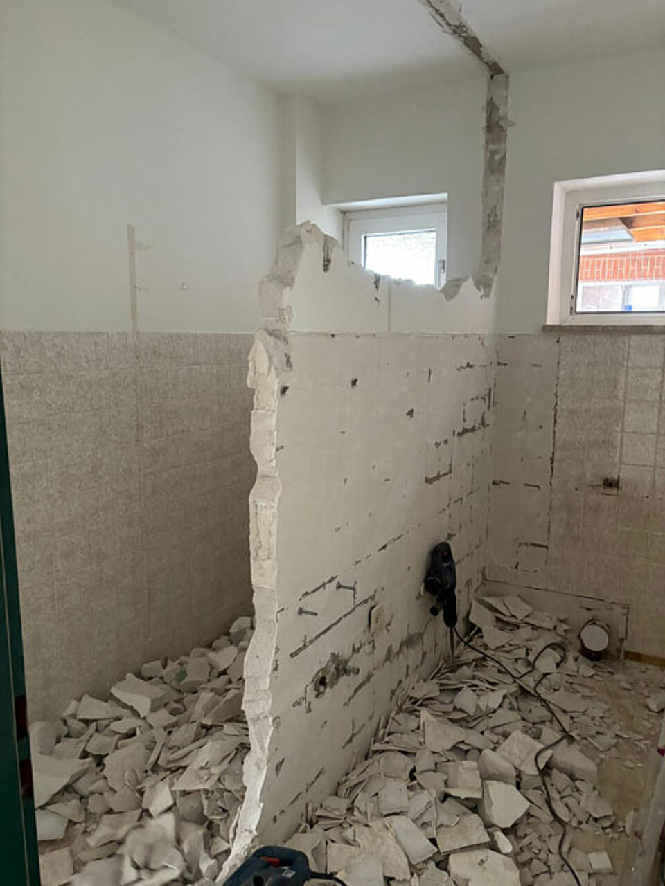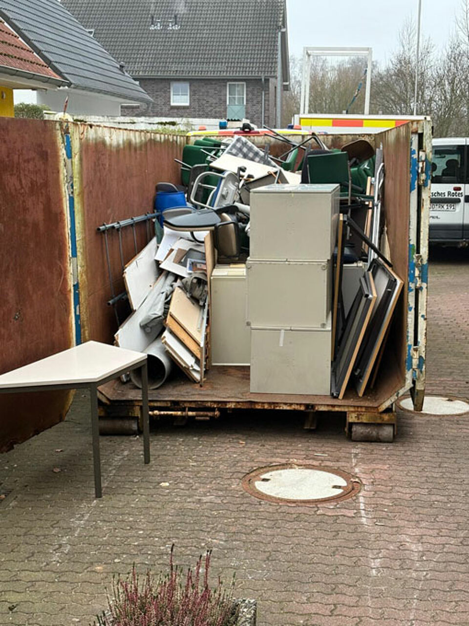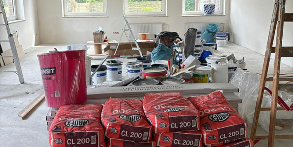 Nach einer umfangreichen Vorbereitungszeit, in der wir die Aufträge für die Arbeiten an lokale Handwerker vergeben konnten, starteten die eigentlichen Arbeiten im März 2025. Vorher räumten die Helfer des DRK OV Reinbek das Haus und lagerten das Mobiliar in der Garage.