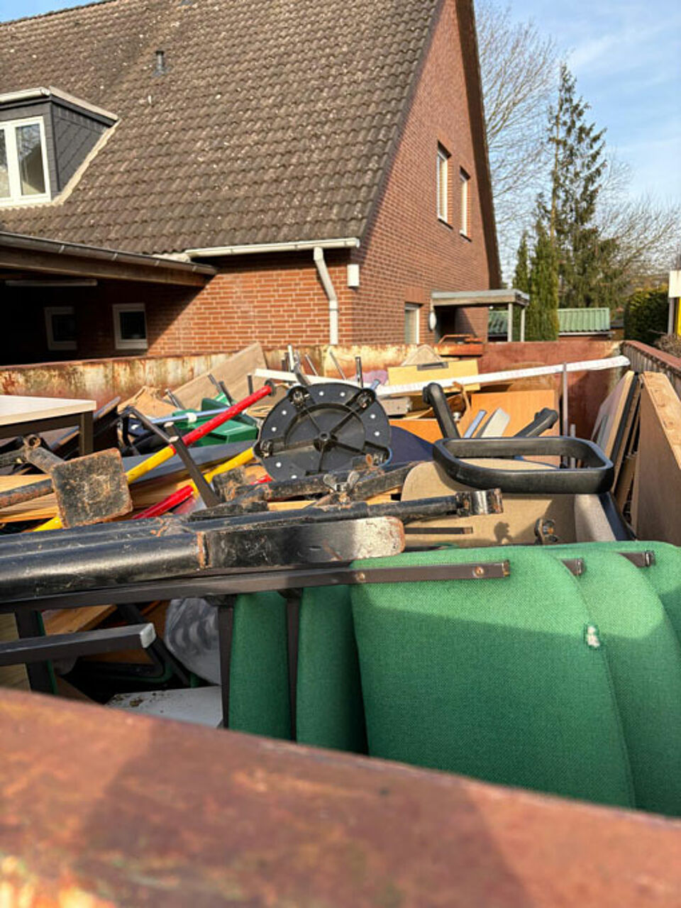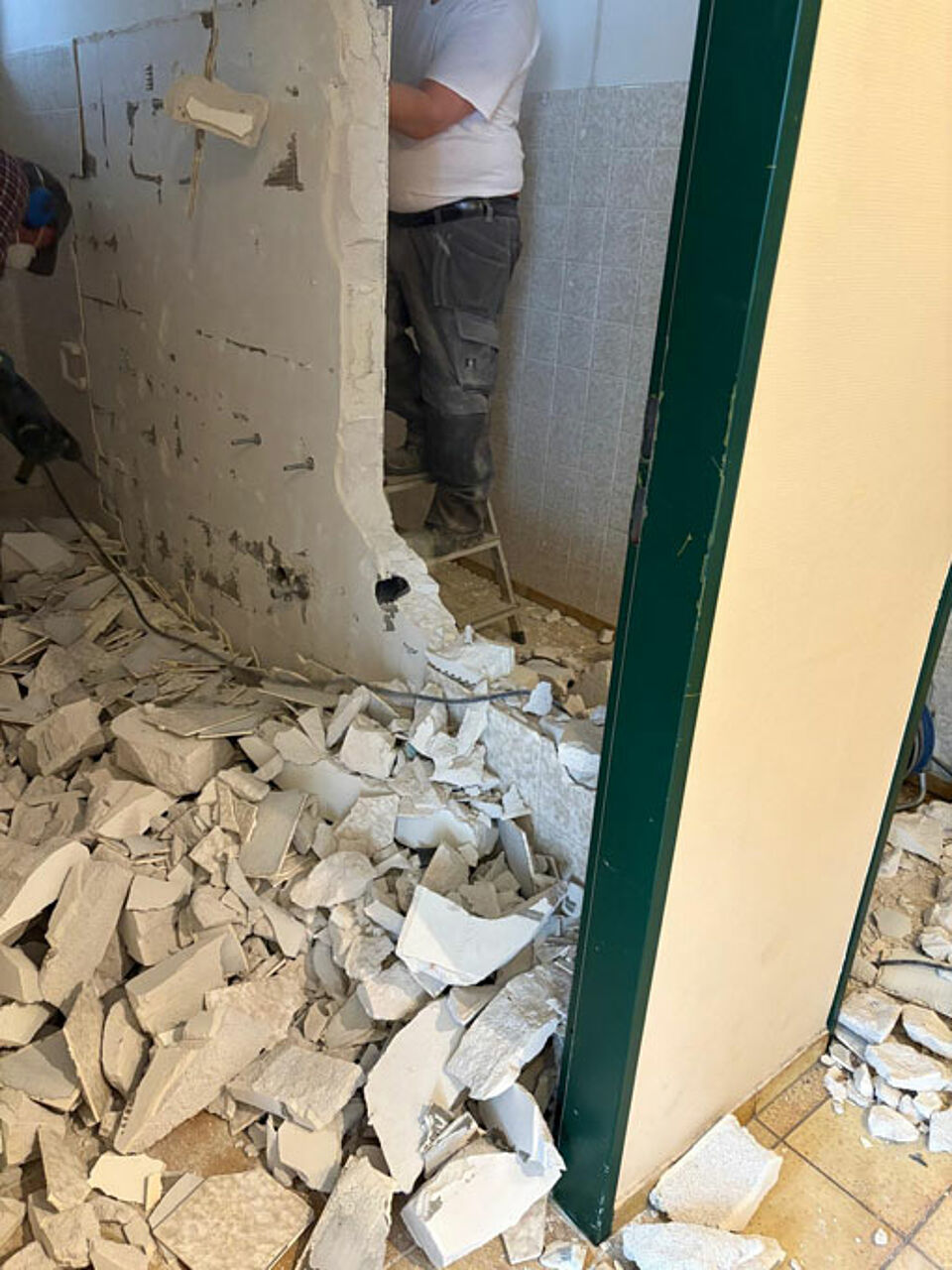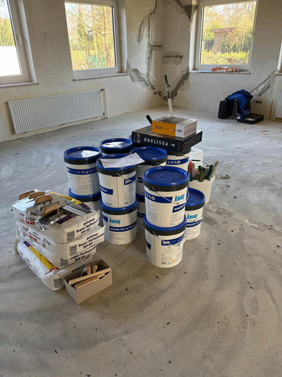 Nach einer umfangreichen Vorbereitungszeit, in der wir die Aufträge für die Arbeiten an lokale Handwerker vergeben konnten, starteten die eigentlichen Arbeiten im März 2025. Vorher räumten die Helfer des DRK OV Reinbek das Haus und lagerten das Mobiliar in der Garage.